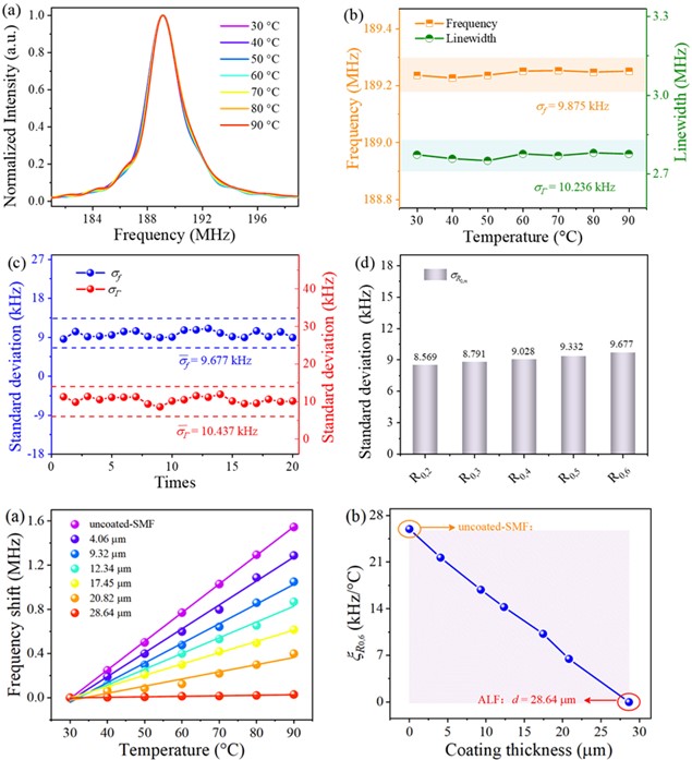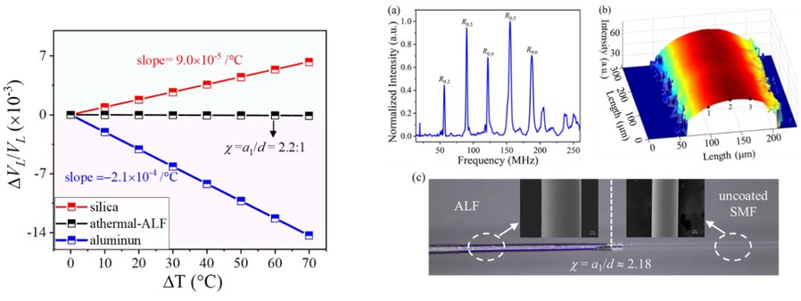 针对这一技术难题,董永康教授课题组首次提出了绝热前向受激布里渊散射机制,通过理论建模、多物理场仿真以及实验验证的闭环研究,创新性地利用镀铝光纤解决了F-SBS技术长期存在的温度敏感性问题。该研究使用铝涂敷层作为热补偿器,通过精确设计铝涂层厚度与光纤包层半径比例关系,使铝涂层的负温度效应可完全抵消光纤包层的正温度效应对声波传播的影响,从而使镀铝光纤中横向声波的等效声速-温度系数趋近于零,实现绝热的F-SBS。此外,通过调控铝涂层的空间分布权重,可进一步实现对F-SBS共振频率温度响应的精准调控。课题组提出的绝热前向受激布里渊散射新机制,不仅推动了前向受激布里渊散射在极端环境(如航空航天、深海探测)中的应用,也为多个波导光声器件(如布里渊光纤激光器、声光调制器)的温度补偿设计提供了全新的理论和技术支持。