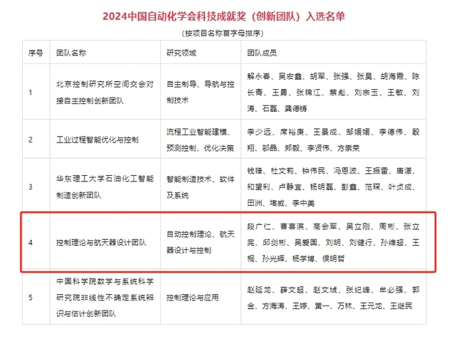 近日,2024中国自动化学会科技成就奖评审结果揭晓。我院控制理论与航天器设计团队荣获2024中国自动化学会科技成就奖(创新团队)。此次共评选出科技成就奖(创新团队)5项、科技成就奖(个人)2项。